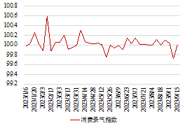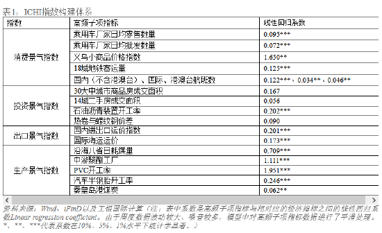 构建中国经济高频景气指标。本文通过计算经济合成指数构建了高频景气指标。指数构建的目的在于洞察当前经济状况变化并前瞻未来短期内的经济走向,因此,我们基于需求法和产业法选取了相关先行指标以反映经济活动在消费、投资、出口以及生产四个层面的景气度变化。首先,消费层面,我们选取代表耐用品消费的汽车销量、轻纺城成交量,以及义务小商品价格指数来跟踪商品消费变化。服务消费方面,由于服务消费相关数据相对稀缺,我们结合部分交运数据反映服务消费情况。具体来说,地铁客运量及航班增速与社会消费品零售总额呈现显著正相关性(地铁客运量及航班增速增加意味消费者出行增加,带动社会消费品零售边际增长)。投资方面,为了深入洞察固定资产投资对经济活动的影响,基于固定投资数据中相关高频数据的可得性和先行性检验,我们选取了热卷与螺纹钢价差(领先制造业投资3-5个月)、石油沥青装置开工率(与基建投资高度正相关)、商品房成交面积以及14城二手房成交面积(与地产投资高度正相关)反映固定资产投资变动情况。出口层面,国内进出口运价指数及国际海运运价与中国进出口额具有显著正相关性。因此,我们选取国内和国际的运价指数来反映中国出口贸易额的变动。最后,为了全面反映经济活动在工业生产层面的变化,我们选取了汽车制造业、煤炭、建材行业、化学原料及制品制造业等广泛性指标来拟合工业增加值变化。基于拟合结果,我们发现耗煤量、PVC开工率、PET指数、汽车半钢胎开工率以及秦皇岛港煤炭库存与工业增加值呈现高度正相关性。综上,我们最终选取了16个高频指标对中国经济活动中的消费、投资、出口、生产进行高动态观测,具体如下: