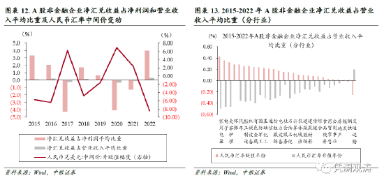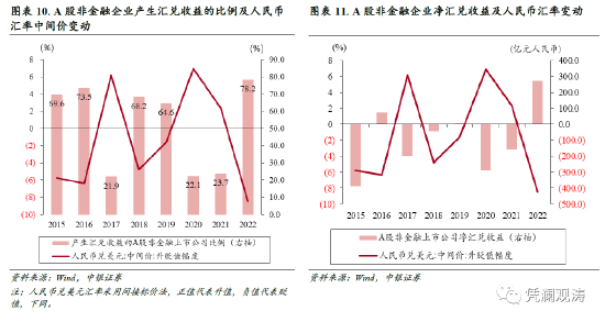 从A股上市公司的财务数据来看,2015-2022年间,人民币汇率在2017、2020和2021年升值,其余年份贬值。根据上市公司披露的盈利数据,A股非金融企业中在升值年份产生汇兑收益的平均比例为22.6%,在贬值年份该比例达到70.8%(见图表10)。