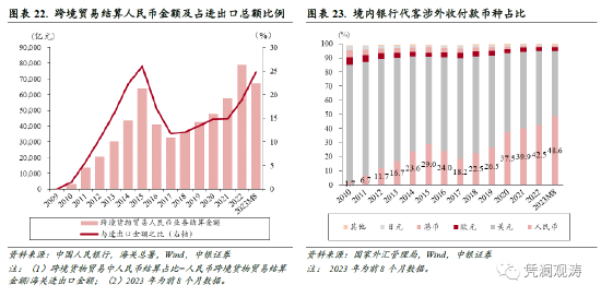 2020-2022年,银行代客涉外收付款中人民币占比均值为40%,较2015-2019年均值24.1%大幅提升15.9个百分点;同期,美元占比由66.5%降至54%,下降了12.5百分点。自2023年3月份以来,银行代客涉外收付款中,人民币占比持续超过美元,前8个月人民币收付累计占比48.6%,高出同期美元占比2.4个百分点(见图表23),跃升为境内第一大跨境收付货币,这有助于提升人民币国际支付功能。