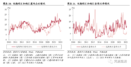 此外,企业使用保值避险工具增多,套保比率上升。2020-2022年,银行代客结汇中远期履约平均占比为16.8%,较2015-2019年均值提升6个百分点;代客售汇中远期履约占比13.9%,提升2.3个百分点。同期,远期结汇和购汇套保比率分别为12%和10%,分别上升5.8和2.2个百分点。2023年前8个月,银行代客结汇远期履约占比18.6%,较2020-2022年同期均值进一步提高同期均值提高了2.0个百分点;代客售汇中远期履约占比10.7%,下降2.3个百分点。同期,远期结汇和购汇套保比率分别为12.7%和5.0%,分别上升0.7个百分点和下降5.2个百分点(见图表20和21),后者主要反映了2022年9月远期购汇外汇风险准备金率上调政策的影响,这会增加企业使用远期和期权对冲汇率风险的成本,进而减少远期购汇需求。