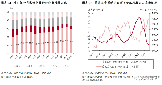 不过,值得指出的是,在银行代客外币涉外收付款中,美元占比依然较高,2020-2022年美元占比均值为90%,较2015-2019年均值高出2.4个百分点。2023年前8个月该比例为89.7%,虽然较2022年同期下降了1.3个百分点,却较2015年仍然高出3.5个百分点(见图表24)。这意味着“8.11”汇改参考一篮子货币调节以来,银行代客跨境外币收付中,企业和居民对美元使用的集中度是提高而非下降,因此人民币兑美元双边汇率变化依然对于国内涉外企业的财务状况有着重大影响。历史经验来看,美国从中国的进口商品价格指数与人民币兑美元汇率呈负相关关系,2015年以来二者相关性为-0.35(见图表25),这反映在人民币双边汇率贬值的情况下,境外采购商通常会要求国内供货商降价,以共同分享贬值形成的财务收益。
