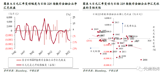 以日经225指数为例,1992-2022年期间,在日元汇率贬值的年份,日经225指数中平均有54.6%的所有非金融企业产生汇兑收益;在日元汇率升值的年份,仅平均有33%的非金融企业产生汇兑收益(见图表7)。2013年和2022年日元汇率分别贬值17.6%和12.2%,日经225指数所有非金融企业分别实现净汇兑收益2739亿和902亿日元;2011年和2020年日元分别升值5.5%和5.2%,则分别实现净汇兑损失3975亿和5308亿日元(见图表8)。1992-2022年,日元兑美元汇率变动与日经225指数非金融企业的净汇兑收益具有明显的负相关关系,二者相关系数为-0.4(见图表9)。