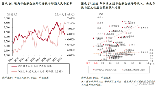 在本币计价计算之外,涉外企业也可以选择“收外汇付外汇”的方式自然对冲汇率风险。根据中国人民银行的统计,2020-2021年人民币汇率升值,境内非金融外汇存款分别增加601亿和948亿美元;2022年和2023年前8个月人民币汇率贬值,境内非金融外汇存款分别减少532亿和526亿美元(见图表26)。这显示,当人民币升值时,境内非金融企业倾向于积累外汇存款,增厚了民间二级外汇储备,起到了“蓄水池”的作用;人民币贬值时,企业倾向于减少外汇存款,用于对外支付或结汇。从微观企业的财务数据来看,2023年上半年,A股非金融企业中海外收入及美元存款与汇兑收益占营业收入比重呈现正相关关系(见图表27),即海外业务收入较多,或者美元存款较多的企业其净汇兑收益占营业收入比重越高。