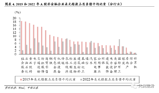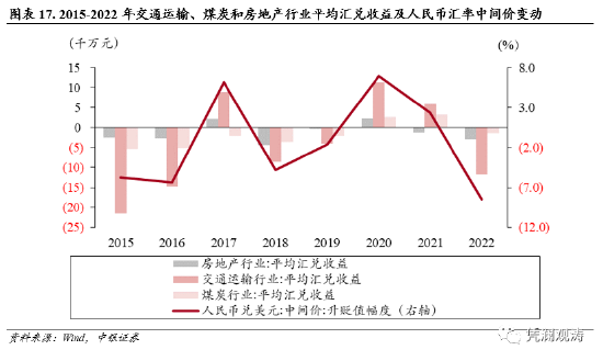 人民币汇率贬值也增加了进口成本和偿债负担。对于原材料高度依赖进口的,人民币汇率贬值加大了进口成本,交通运输和煤炭行业在人民币贬值年份产生的净汇兑损失较多。同时,房地产企业作为中资美元债的重要融资主体,2022年以来汇率贬值叠加国内地产市场降温,加大了外债偿还压力。