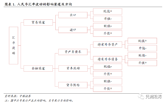 人民币汇率波动会通过贸易和金融渠道对宏观经济和微观主体产生影响。在此前的报告中,我们曾指出汇率波动主要有四种影响渠道[1],汇率升贬值通过各个渠道的影响方向不尽相同(见图表1)。