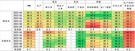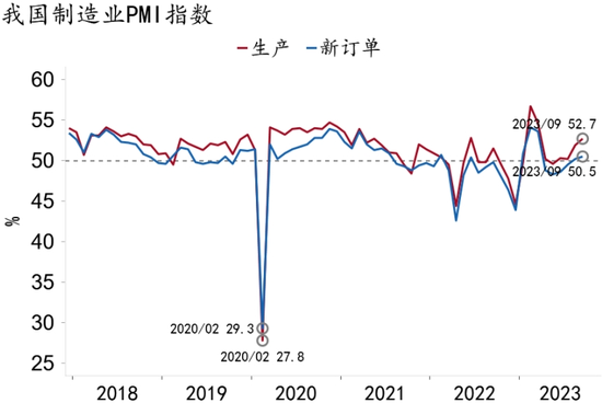 9月制造业PMI环比连续第四个月回升,但仍低于疫前三年(2017-2019年)同期均值。产需两端景气度均有改善,生产修复持续快于需求。在生产端,9月生产指数环比回升0.8pct至52.7%,连续第四个月位于扩张区间。在需求端,内外需景气度保持分化。新订单指数环比上升0.3pct至50.5%,连续第二个月位于扩张区间,内需修复动能稳步改善;出口订单指数环比回升1.1pct至47.8%,连续六个月位于收缩区间,出口增速下行压力仍在加大。