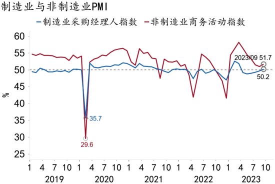 9月制造业PMI环比上升0.5pct至50.2%,时隔六个月重回扩张区间。非制造业PMI环比上升0.7pct至51.7%。制造业与非制造业景气度同步改善至荣枯线上方。