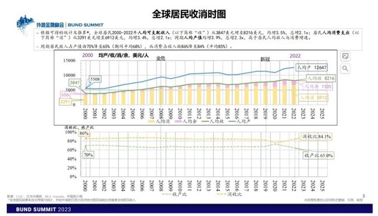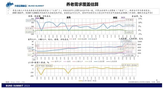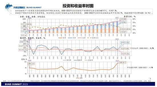刚才谈过,全球金融资产一定程度是居民储蓄抗御包括养老在内的未来不确定性形成的。2000年至2022年,全球金融资产由103万亿美元增至487万亿美元。对其收益率进行分析,金融资产大致的平均收益率为5%,当前金融资产总量为接近500万亿美元,那么当年产生的金融收益约25万亿美元。