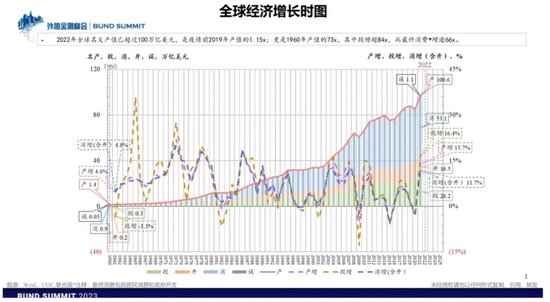 从1960年至2021年,60余年来,全球总产值、消费和投资等数据的增长出现了15个尖峰,平均每四年一个周期,与美国竞选周期时长一致,尚不清楚是否有具体联系。在这60年中,全球价格增长了近9倍,而全球真实量产出增长了8.2倍。