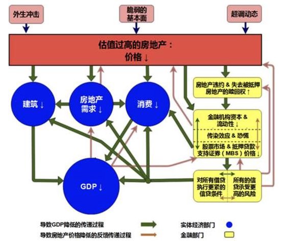 下图展示的是这一分析框架运用到2008年房地产暴跌后对金融市场和实体经济的冲击机制。实际上,其中的关键机制还没有被纳入到现在全球各大央行建立的大规模经济预测模型里。