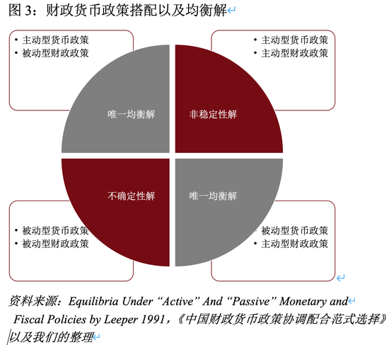基于以上三方面,不同状态的货币和财政政策的相互作用将会形成不同的均衡结果,学术研究提出了四个象限的均衡结果,其中主动型货币政策+被动型财政政策与被动型货币政策+主动型财政政策的组合都可以达成唯一均衡解。实证结果进一步证明,不同外生冲击背景下,主动型货币政策+被动型财政政策与被动型货币政策+主动型财政政策各有所长。