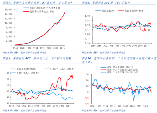 美国之所以能实现长期经济增长稳定,其中最主要的条件就是实现了平均消费倾向的基本稳定。通过回归发现,美国居民的消费是收入和财富的函数,边际消费倾向是劳动收入占收入比重和财富占收入比重的函数,我们测算得到长期的平均消费倾向稳定在0.88左右,大约高出中国0.2水平。实际美国居民APC在0.88中枢水平上呈现出一定的周期性变动,原因是在短期内资产数量稳定,收入随经济和商业周期波动,消费和收入在短期消费曲线上移动。从更长期来看,资产的增加使短期消费曲线向上移动,平均消费倾向和边际消费倾向均保持稳定。