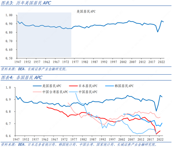 在收入沿着经济增长的趋势增长时保持不变,我们测算得到美国长期的平均消费倾向稳定在0.88左右,大约高出中国0.2水平。实际美国居民APC在0.88中枢水平上呈现出一定的周期性变动,原因是在短期内资产数量稳定,收入随经济和商业周期波动,消费和收入在短期消费曲线上移动。从更长期来看,资产的增加使短期消费曲线向上移动,平均消费倾向和边际消费倾向均保持稳定。