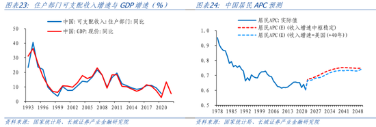 方法一:居民收入增长率与GDP增速呈正相关关系,相关系数达0.95,我们用GDP增速来拟合居民收入增速并进行修匀得到长期收入增速,其中,GDP增速由中国潜在增速(测算方法见《中国潜在经济增速初探》)和GDP平减指数测得。我们对中国经济增速测算到2030年,并假设2031-2050年增速中枢维持不变,对居民APC进行预测。