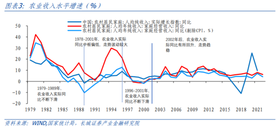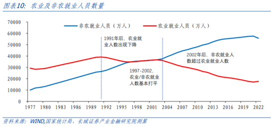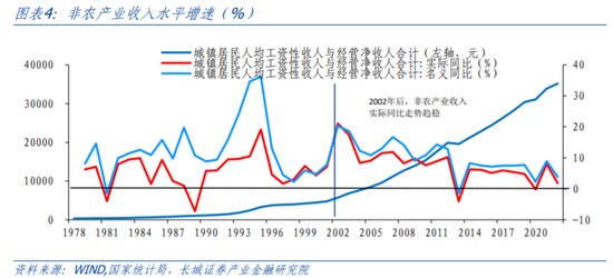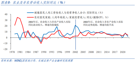 我们在重测劳动收入份额的同时,注意到农业收入水平和非农产业收入水平的实际增速都有较明显的分段。1978-2001年农业收入同比增速平均约为7.4%,并且波动幅度较大,2002年后农业收入增速回稳,2002-2022年均增速提升至7.9%并且波动幅度明显变小;类似的,1978-2001年非农产业收入水平增速的波动性较强,且整体增速偏低,年均增长5.7%;2002-2022年非农产业收入水平增长趋于稳定,增速中枢提升至7.8%。