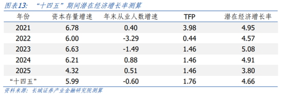 对于资本投入、劳动投入和全要素生产率的预测,我们基本维持《中国潜在经济增速初探》的方法。并且结合2004-1978年的α、β值,计算得出2022-2030年潜在经济增长率。未来一段时间,资本存量增长将仍是经济增长的重要贡献力量;关于劳动力投入增长,整体全国劳动人口数量增速放缓趋势仍将主导。虽然二孩政策全面放开,但在没有转化为实际劳动力前,劳动力增长对经济增长的贡献会持续减弱。预测结果显示,“十四五”期间,我国潜在经济增长率可能在4.7%-5.2%之间,2023年、2024年分别为5.1%和4.9%。