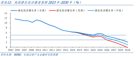 我们结合2004-1978年的α、β值,重新测算得出2022-2030年潜在经济增长率。预测结果显示,“十四五”期间,我国潜在经济增长率可能在4.7%-5.2%,2023年、2024年分别约为5.1%和4.9%,这一潜在增速偏低。