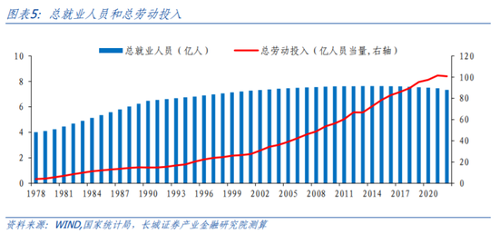 二是统计局官网公布的国家统计年鉴最早截至1999年。这意味着前述方法仅适用于1985年、1990年以及1997年-2001年。我们发现国家统计年鉴自1978年开始公布“职工平均货币工资”,(时间涵盖1978/1980/1985,1986-1998年),尽管平均货币工资与城镇居民人均工资性收入+经营性收入并不一致,但根据已知的数据对比来看,两者之间存在一定的比例关系。我们按此关系大致推算工资性+经营性收入。最后再将少数空缺值利用趋势差值法进行填补。最终得到1978-2022年非农产业的名义收入水平及其同比的时间序列。剔除价格因素(CPI)后将此数据指数化(1978年=1),乘以对应年份的第二、第三产业劳动人数,来代表非农产业劳动投入量。农业、非农产业劳动投入量加总即可视为总劳动投入量。