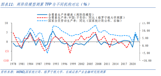 在两阶段增长模型下,我们测算的全要素生产率在走势上与国家统计局公布的国家全员劳动生产率同比较为接近,而数值上与荷兰格罗宁根大学测算的较为接近。我们认为可以较好地衡量1978年以来我国全要素生产率的增长。