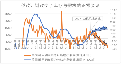 因乐观预期引致的过度补库存历史上不止发生一次。比如,2017年特朗普政府实施了一项税改计划,通过简化税法、鼓励企业增加投资、刺激居民消费,人为地改变了经济活动的预期,扭曲了企业的存货投资行为。在2017年前,美国库存量总体是滞后跟随新订单的变化而变化,表现出显著的顺周期性。但是,在2017年12月份后耐用品新增订单增速呈下降趋势,耐用品总库存量却一改顺周期性,保持坚挺的增速直到新冠疫情爆发。这其中原因就在于特朗普税改政策改变了人们的预期,带来持续增长“幻象”。