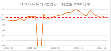 一是企业在乐观预期下过度补库存。需求情况是企业形成对未来预期的基础,企业往往会根据对需求的预期调整其存货。2020年初在经济遭遇疫情严重冲击之后,我国迅速复工复产,经济率先复苏——PMI在2月急剧下跌之后,迅速回归,走出了一条探底反弹的“V型”曲线,3月之后制造业新订单指数连续17个月处于扩张区间,使得企业对未来充满信心。