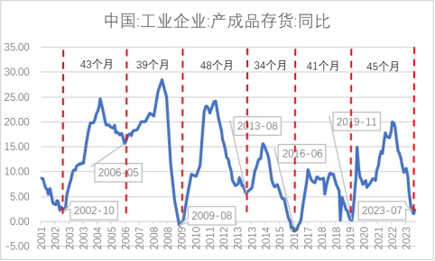 在经历45个月之后,2023年7月我国工业产成品库存增速出现局部低谷,当前库存波动又已入新的补库存阶段。