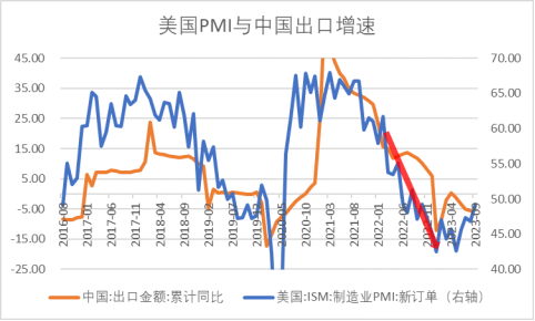 内需受到压制的同时,2022年以来海外需求进入了加速下行阶段,我国出口动能下降,迫使总需求减弱,同样引起“被动去库存”过程缓慢。