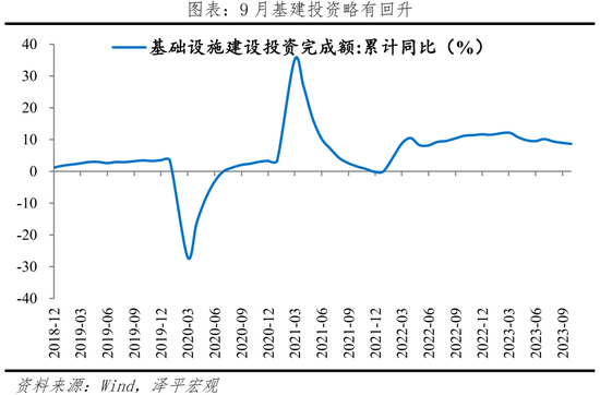 9月社会消费品零售总额同比增长5.5%;制造业投资当月同比增长7.9%;基础设施建设投资同比增长6.8%。商品房销售面积和销售额同比分别为-10.1%和-13.6%;房地产投资同比-11.3%,新开工、新增施工和竣工面积同比分别为-14.6%、-7.1%和25.3%。
