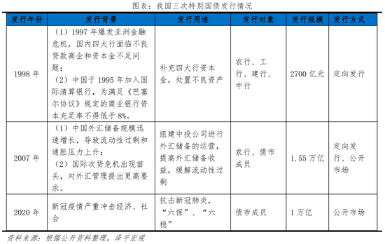 特别国债是为特定目标发行的,具有明确用途的国债,具有专款专用、用途灵活的特点,我国发行特别国债的时间为1998、2007和2020年。其中,1998年的特别国债用于亚洲金融危机之下的四大行资本金补充;2007年的特别国债用于提高外储收益、缓解流动性过剩压力,2020年则用于“抗疫”。2017年10月的6000亿特别国债是续作2007年。