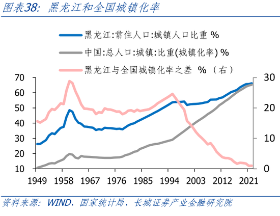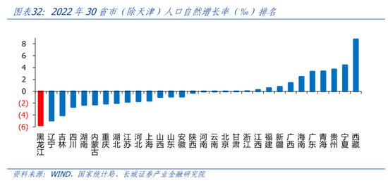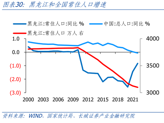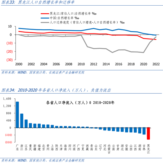 另一方面,黑龙江人口流失问题严峻。2010-2020年,黑龙江人口净流出632万,是全国人口流出最多的省份。以常住人口增速和人口自然增长率之差代表人口迁移速度,2011年-2020年,黑龙江人口迁出速率平均为-18.4‰,2020年更是达到了-21.33‰。因为在2021年和2022年疫情限制了人口流动,黑龙江人口流失才得以缓解。但是随着社会生活逐渐步入正轨,人口流失的问题还将出现。