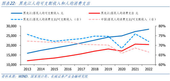 在消费端,黑龙江人均可支配收入增速低于全国水平,社会消费品零售总额增速也低于全国水平。2013-2022年,黑龙江人均可支配收入从1.59万元增长至2.83万元,增长78%;人均消费支出从1.20万元增长至2.04万元,增长70%;消费占可支配收入的比重从75.7%小幅下降至72.0%。2014年-2022年,黑龙江人均可支配收入增速平均为6.65%,而全国平均增速为8.11%,明显跑输全国。在收入增长较为缓慢的影响下,黑龙江社会消费增长也不及全国水平。