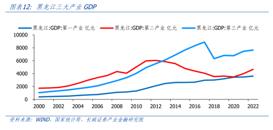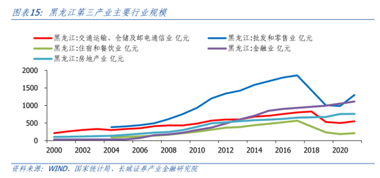 2018年黑龙江第三产业GDP挤出水分,之后重新恢复增长。2018年,黑龙江第三产业GDP总量6309.3亿元,较2017年8876.8亿元减少了28.92%。2018年-2022年,黑龙江第一、第二、第三产业的年均复合增速分别为4.72%、7.08%、4.91%。可以看到,黑龙江第三产业增长相对第二产业来说较为缓慢。从第三产业的结构来看,黑龙江和全国较为相似。2021年批发零售业产值1298.96亿元,占比18.0%;金融业产值1112.91亿元,占比15.4%。从增速来看,2019年-2021年,批发零售业、房地产业、金融业年均复合增长13.67%、6.43%、5.74%,增速较快;住宿和餐饮业年均复合增速-5.71%,受疫情影响严重。
