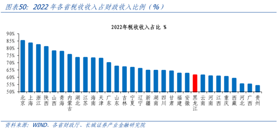 黑龙江财政自给率较低。以地方财政收入占支出的比重来衡量财政自给率,黑龙江财政自给率从2014年的37.9%下降至2022年23.7%。2022年黑龙江财政自给率在31省市中排名第27位,仅高于甘肃、吉林、青海和西藏。2022年,黑龙江税收收入793.3亿元,占财政收入的61.5%,排在全国第23位。黑龙江省较为依赖中央转移支付,2022年中央对黑龙江转移支付4226.5亿元,排在全国第7位。