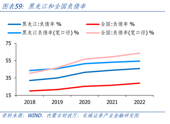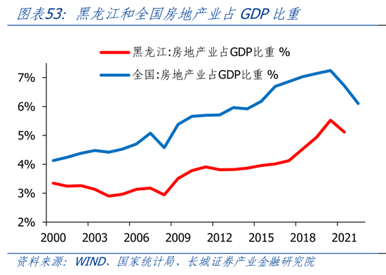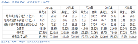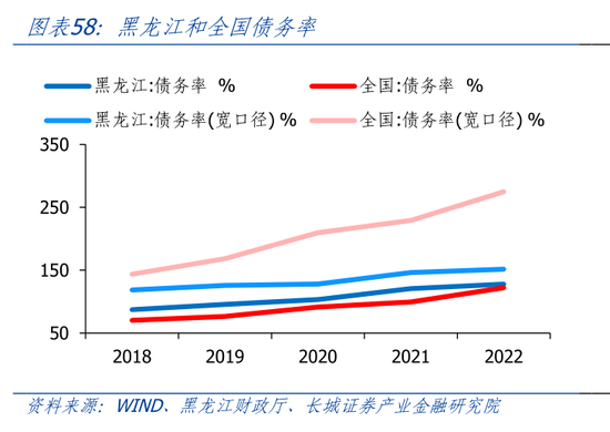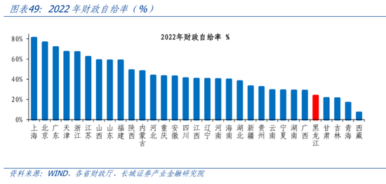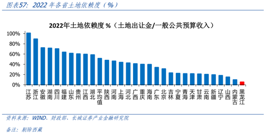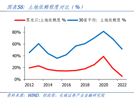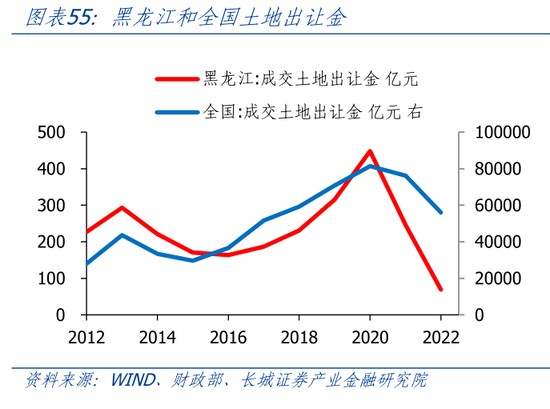 黑龙江土地依赖度全国最低。长期以来,由于房地产市场并不发达,且较早进入调整周期,黑龙江财政对土地依赖程度不高。我们以成交土地出让金占地方公共财政收入的比例来近似衡量土地依赖程度。2021年黑龙江土地出让占财政收入的比重为18.9%,但2022年土地出让金大幅减少,导致2022年财政土地依赖度下降至5.3%,远低于全国平均水平的51.5%,在30省市中(除西藏)排名倒数第一。