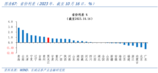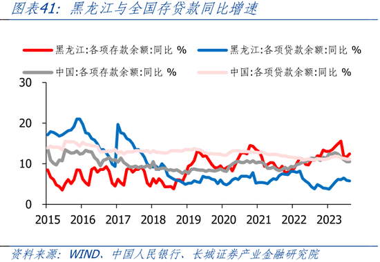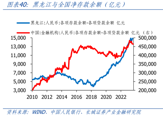 2018年开始,黑龙江净存款快速增加。2018年4月净存款(各项存款余额-各项贷款余额)为3846亿元,到2023年8月增加至14892亿元,其中存款增加了17562亿元,而贷款只增加了6516亿元。2018年至今,黑龙江存款增速一直高于贷款增速。从存贷比来看,2010-2017年,存贷比持续上升,而2018年至今,存贷比快速下降。2023年8月,黑龙江存贷比0.64,远低于全国水平的0.83,说明存款增长较快而贷款需求不足。