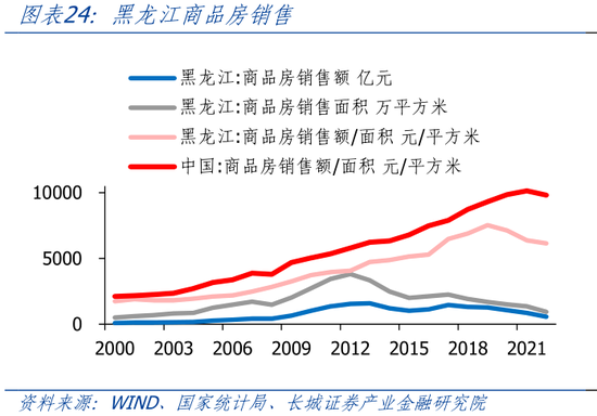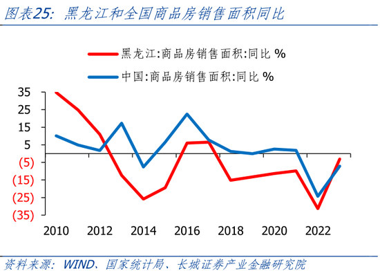 黑龙江房地产消费景气不足,房地产市场比全国更早进入调整周期。2012年开始,黑龙江房地产销售面积就进入下降趋势,这比全国房地产调整周期来得更早。2019年之后,黑龙江房价开始明显下行,而全国房价是2021年才开始下跌。2023年1-8月,黑龙江商品房销售额、销售面积累计同比分别为-1.0%、-3.1%,相较于全国商品房销售额、销售面积累计同比为-3.2%、-7.1%,黑龙江房地产销售降幅低于全国水平。