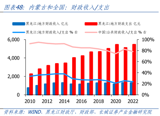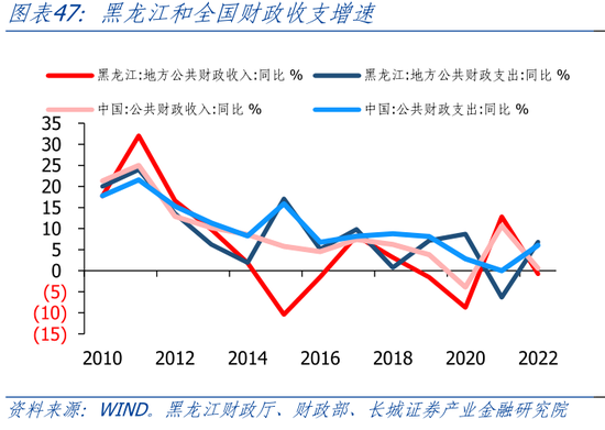 黑龙江财政收支增速基本与全国节奏一致,在部分年份有所差异。先看财政收入,2011年-2016年,全国范围内财政收入增速是在下降的,黑龙江省则下降更快。其中2015年黑龙江地方财政收入同比-10.4%。这可能与2015年油价下跌有关。《黑龙江省2015年预算执行情况》中指出“2015年全省一般公共预算收入1165.2亿元,下降10.4%,剔除原油因素下降2.7%”。2017年-2022年,黑龙江与全国财政收入增速同向变化。其中2022年财政收入同比-0.76%,低于全国1.33个百分点。其次财政支出,2011年-2022年,黑龙江财政支出增速总体处于下降趋势。其中2022年黑龙江财政支出同比6.8%,高于全国0.74个百分点。