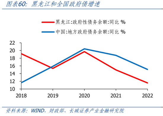 作为财政收支的补充,黑龙江政府性基金收支较弱。2022年地方政府性基金收入152.9亿,在31省市排名倒数第三,仅多于青海和西藏;同比下降58.7%,《黑龙江省2022年预算情况》指出“主要是市县土地出让收入减收”。2021年黑龙江政府性基金收入同比-17.60%,全国4.85%;政府性基金支出同比-27.93%,全国-3.95%。2022年政府性基金收入同比-58.71%,全国-20.53%;政府性基金支出同比-26.88%,全国-2.45%。黑龙江连续两年政府性基金收支增速均低于全国。