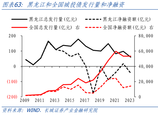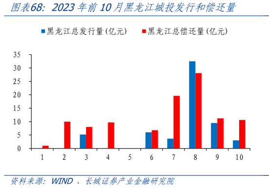 2017年-2022年,除了2020年外,黑龙江城投债净融资额均为负值,黑龙江努力化解隐形债务负担。2012年之后,黑龙江城投债总发行量占全国比重逐年递减,从2012年占比2.11%下降至2022年占比0.11%。2017年之后,除了2020年,城投债发行量较大外,黑龙江城投债发行量总体呈现下降趋势。而且随着到期偿还量增加,黑龙江城投债近6年中有5年是净偿还。