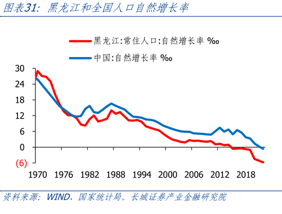 黑龙江人口自然增长率全国倒数,且人口流失问题严重,人口负增压力是经济发展的最大困难。2010年,黑龙江常住人口达到3833万人的顶峰,之后就快速下降,2022年常住人口已降至3099万人。一方面,黑龙江人口自然增长率较低。自1978年之后,黑龙江人口自然增长率就低于全国水平。2022年,黑龙江人口自然增长率为-5.75 ‰,在31省市中排名倒数第一。不仅仅黑龙江,东三省整体人口自然增长率较低,辽宁倒数第二-4.96 ‰、吉林倒数第三-4.07 ‰。