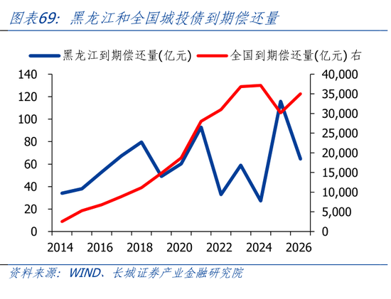 2023年,黑龙江城投债各月偿还节奏较为平稳,8月为偿还高峰,1月偿还量最低。2024年黑龙江城投到期偿还量为27.25亿元,为2014年以来的最低值。但是2025年,黑龙江城投债到期偿还量将达到115.87亿元的顶峰。