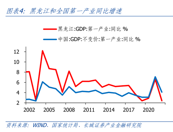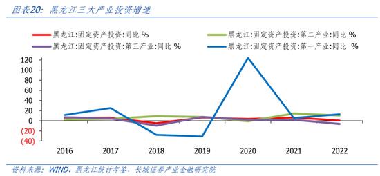 从结构来看,黑龙江第一、第二产业投资增速较高,第三产业投资增速较低。2022年,黑龙江固定资产投资同比0.6%,其中第一、第二、第三产业投资同比增速分别为13.1%、10.6%、-6.3%。近三年,黑龙江第一产业投资增长最快,2020年-2022年复合年均增速为38.8%,其中2020年第一产业投资同比增长124.1%。一方面是低基数原因,2018年和2019年第一产业投资同比-30.8%和-27.6%。另一方面为了国家粮食安全,黑龙江加大了对农业的投资。