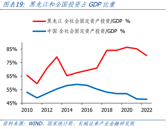 在投资端,黑龙江投资占GDP比重较高,投资增速较低。从比重来看,2014年-2020年,黑龙江投资占GDP比重上升,尤其是2018年升高至83.8%,主要原因可能是经济数据挤水分导致分母变小。2020年-2022年,投资占GDP比重逐渐下降,但是2022年比重仍在80.2%,远高于全国47.9%的平均水平。从增速来看,2014年之后,黑龙江投资增速就基本低于全国水平,除了在2019年-2021年小幅跑赢全国。2023年1-8月,黑龙江固定资产投资完成额同比-13.5%,远低于全国水平的3.2%。黑龙江投资下滑幅度较为明显。