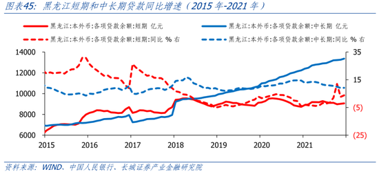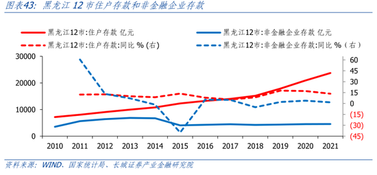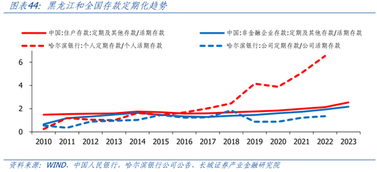 从存款端来看,居民存款增长较快,存款定期化趋势明显。2010-2021年,黑龙江12市(除大兴安岭地区)住户存款持续增长,尤其是2018年后住户存款加速上升。企业存款在2015年明显下降至4049.2亿元,之后缓慢增长至2021年4574亿元。由于黑龙江未公布住户和企业的活期、定期存款情况,我们以黑龙江省本地哈尔滨银行的数据衡量存款定期化趋势。2018年开始,哈尔滨银行个人定期存款/活期存款迅速上升,2020年短暂回落后又再度加速上升。