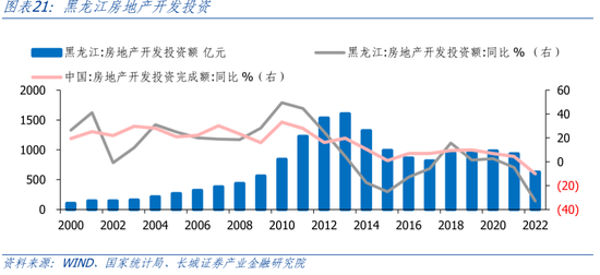 黑龙江房地产开发投资连续两年深度负增。2013年,黑龙江房地产开发投资达到1605亿元的峰值后开始下降,2018-2020年短暂企稳,之后重新进入下行周期。2021年,黑龙江房地产开发投资同比-4.8%,2022年同比为-32.8%,2023年前8月同比为-30.5%,已经连续三年负增,近两年深度负增。2022年,黑龙江房地产开发投资完成额627亿元,较2013年减少了约1000亿元。从开发投资可以看出,黑龙江房地产下行压力比全国更大。