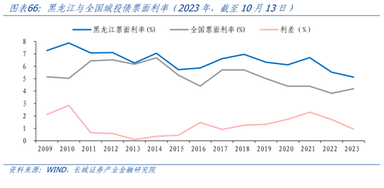 2009年以来,黑龙江城投债票面利率均高于全国水平。2015年-2021年,黑龙江与全国的城投债利差有逐渐扩大的趋势。2021年-2023年,黑龙江城投债利率从6.70%下降至5.13%。(截止2023年10月),而全国城投债利率在2023年回升,黑龙江和全国的城投债利差缩小至0.94%。这一利差在全国31省市中排在第8位,侧面反映出当前黑龙江城投债风险依然较高。