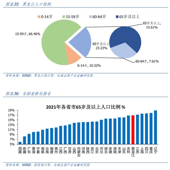 黑龙江人口老龄化问题同样显著。根据2020年第七次人口普查数据,黑龙江60岁以上人口占比23.22%,比全国水平高4.5个百分点,排名全国第3位;65岁以上人口占比15.61%,比全国水平高2.1个百分点,排名全国第6位。按照国际通用划分标准,黑龙江人口已进入“中度老龄化”阶段。更为严峻的问题是,黑龙江60-64岁人口比例7.61%,位居全国第二,仅次于辽宁,这意味着未来5年,黑龙江65岁及以上老龄人口必将继续增长,老龄化问题更加严重。2021年抽样统计显示,黑龙江65岁人口比例已经升高至16.78%。