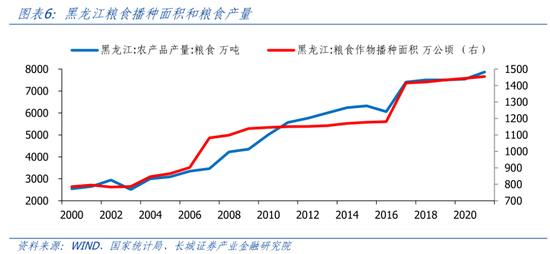 黑龙江粮食产量常年位居全国第一。黑龙江省地貌特征为“五山一水一草三分田”,黑土地是最肥沃的土壤,全世界四大块黑土区之一就位于东北平原,黑龙江省黑土地面积占全国黑土地面积的45.7%,其中典型黑土耕地面积占东北典型黑土耕地总面积的56.1%。土地肥沃,河流密布,黑龙江农业资源优势显著。2022年,黑龙江粮食总产量为1552.6亿斤,占全国总产量的11.3%,连续13年位居全国首位。