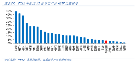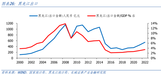 在出口端,黑龙江外贸正在回升,但占GDP比重依然较低。分阶段来看,2000年-2008年,黑龙江出口快速增长,占GDP比重随之升高;2008年-2014年,黑龙江出口平均约为1000亿元,但波动较大;2014年-2018年,黑龙江出口快速下滑,2018年出口仅294亿元;2019年-2022年,黑龙江出口逐渐回升。2008年黑龙江出口占GDP比重高达13.84%。到2022年占GDP比重已降至3.43%,在全国31省市中排在第26位。