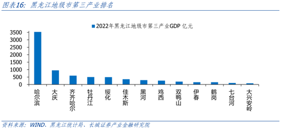 黑龙江第三产业发展整体落后于全国平均水平。代锦东、乔利群(2022)指出黑龙江第三产业发展落后主要表现在“一是产业规模不足7000亿元(2020年),三次产业占比不足50%,远落后于国内发达地区。二是产业发展结构不合理,传统服务业占比较大,现代服务业整体发展落后。三是地区发展不平衡,哈尔滨市第三产业一家独大占据半壁江山。四是服务业容纳就业能力不足,服务业就业水平较低”。2022年,哈尔滨市第三产业GDP为3533亿元,占黑龙江省第三产业7642亿元的46.2%。